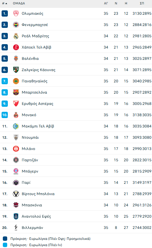 Με αυτό το αποτέλεσμα οι Πειραιώτες «σκαρφάλωσαν» στην κορυφή της βαθμολογίας, πιάνοντας τη Φενέρμπαχτσε του Σαρούνας Γιασικεβίτσιους στην πρώτη θέση με ρεκόρ 23-12. Μάλιστα, το σύνολο του Γιώργου Μπαρτζώκα έχει υπέρ του την ισοβαθμία, καθώς έχει πάρει τη διαφορά στο ΣΕΦ από τους Τούρκους! Συνεπώς, με 3/3 η ελληνική ομάδα με Ρεάλ Μαδρίτης (εντός), Χάποελ Τελ Αβίβ (εκτός), Αρμάνι Μιλάνο (εντός) θα τερματίσει σίγουρα πρώτη και καλύτερη στην κανονική διάρκεια για δεύτερη σερί σεζόν!